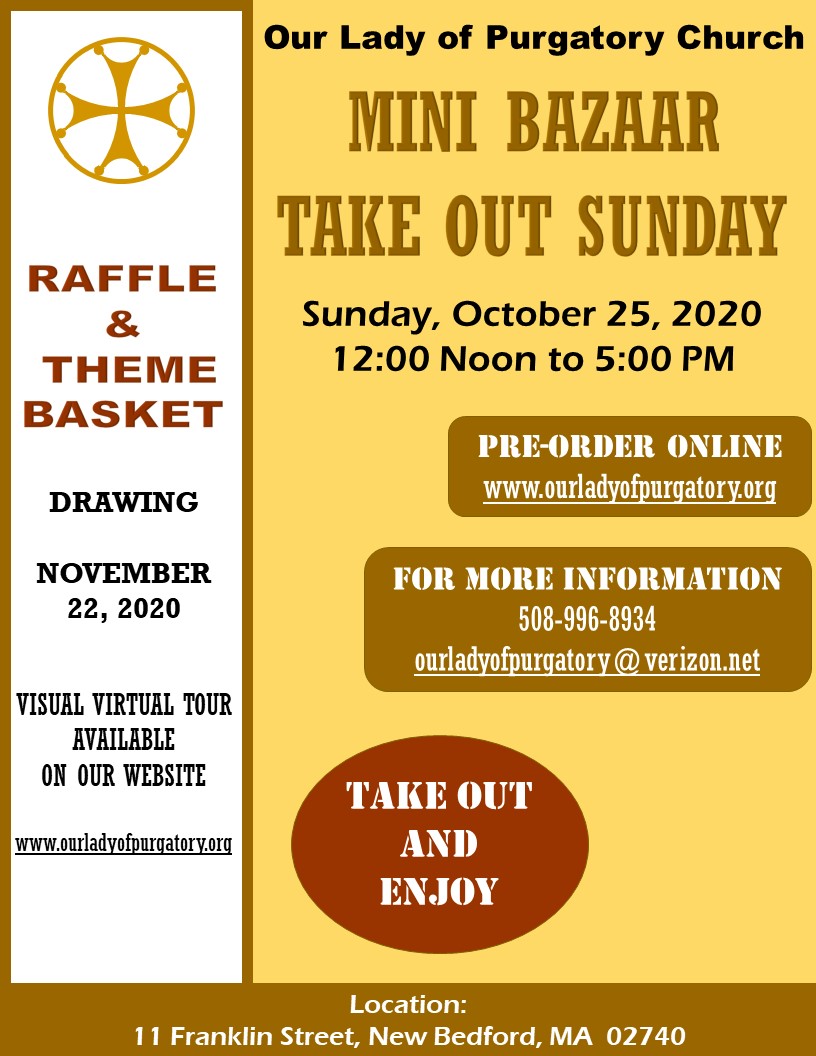 We are happy to announce that we will be sponsoring a Mini Christmas Bazaar/Take Out Food Fest on Sunday, October 25th from 12 Noon to 5 PM! This special fundraiser is taking the place of the Summer Festival and Christmas Bazaar due to Covid-19. In light of the pandemic, this event will be pre-paid & carry-out only.