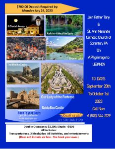 I am kindly asking you a favor, to share my pilgrimage trip to Lebanon (9/20/23 to 10/01/23) with your parishioners. I am sorry for this last minute request. The last day to reserve is the end of July.