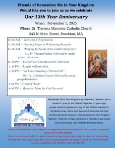 On the occasion of the 13th Anniversary of Remember Me In Your Kingdom, you are invited to a day of reflection at Saint Theresa Maronite Church in Brockton, MA. There are no registration fees but you are asked to register so that they may plan accordingly for meals. God bless this beautiful ministry and those involved who pray for all the souls of the faithful departed.