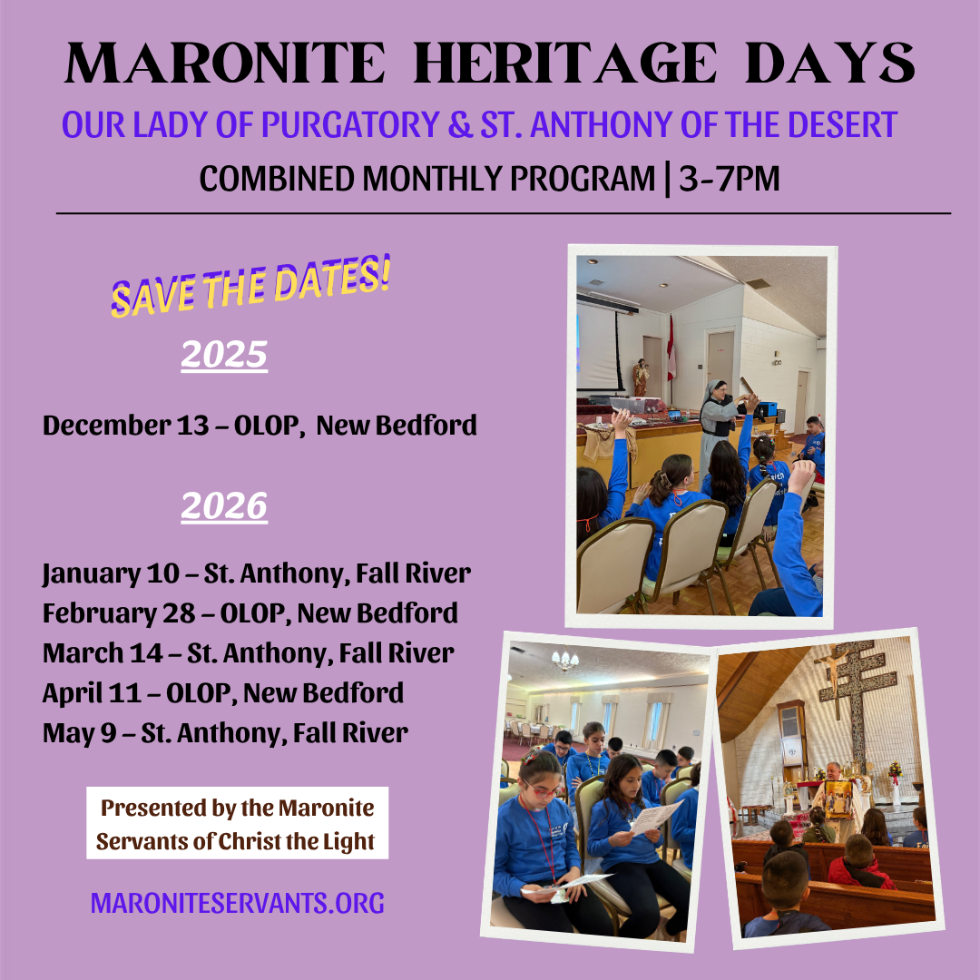 Attached is the schedule for the Maronite Heritage Days for our children for the year. The first one is this Saturday, November 8, at St. Anthony in Fall River. It will be at 3:00 PM until 7:00 PM, in the Church Hall. Please mark your calendars. Thank you to the Maronite Servants of Christ the Light for their dedication with this program. The registration link is listed below: