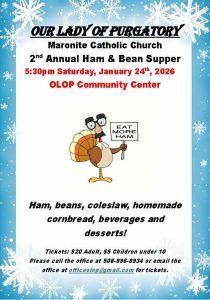 Please join us on Saturday, January 24, 2026 at 5:30 pm at the OLOP Parish Center, 4254 Acushnet Avenue, New Bedford for our annual Ham & Bean Supper. In addition to Ham & Beans we’ll be serving Macaroni & Cheese, homemade cornbread, cole slaw, desserts and beverages, and so it’ll be an opportunity to share some comfort food and the laughter of family and friends on a cold January night.