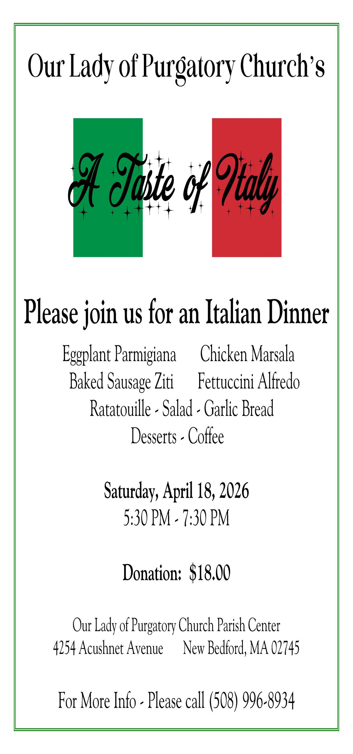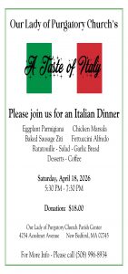 Our next dinner extravaganza will be held on Saturday, April 18, from 5:30-7:30 PM. Come and get a taste of Italy at its finest. Reservations are requested so please contact the office at officeolop@gmail.com. We look forward to seeing you here.
